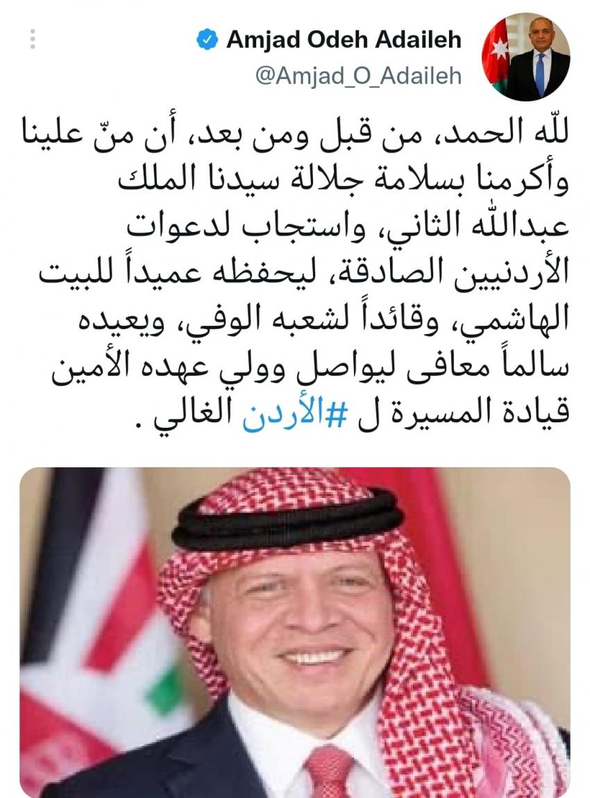 العضايلة مهنئا الملك: للّه الحمد من قبل ومن بعد