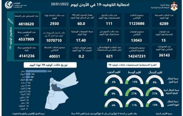 15 وفاة و6289 اصابة كورونا جديدة في الأردن