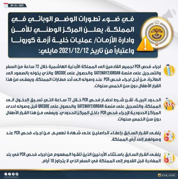 إدارة الازمات تعلن الاجراءات الجديدة للقادمين إلى الأردن