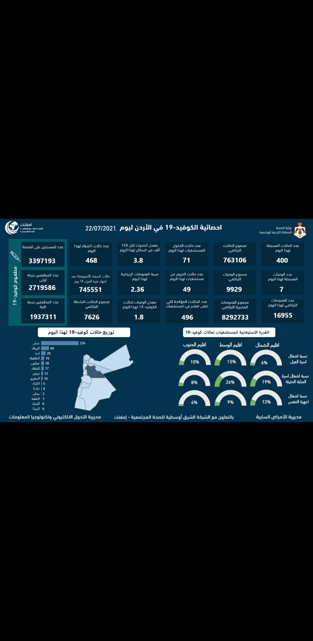 الاردن : 7 وفيات و 400 اصابة جديدة بكورونا