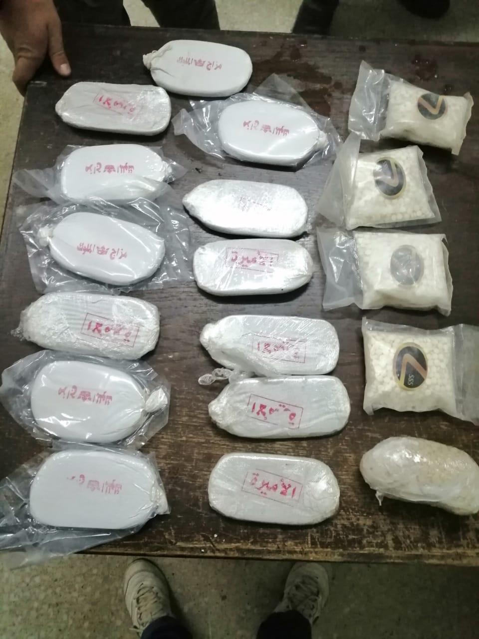 ضبط 10 آلاف حبة مخدرة و13 كفاً من مادة الحشيش المخدرة بحوزة تاجرين ومروجين للمواد المخدرة على الطريق الصحراوي