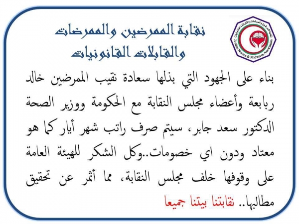 صرف راتب شهر أيار للعاملين في الصحة من الكوادر الطبية والتمريضية دون خصومات