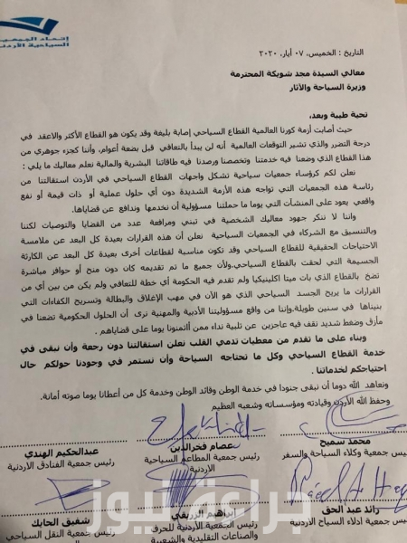 رؤساء الجمعيات السياحية بالاردن يقدمون إستقالتهم لوزير السياحة شويكة "وثيقة"