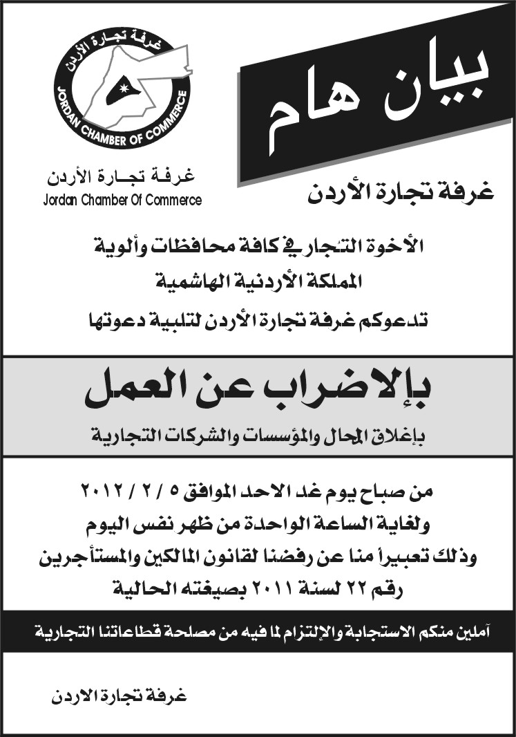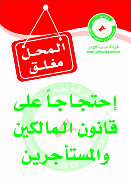 يغلق تجار المملكة يوم غد الاحد محلاتهم في خطوة تصعيديه منهم تجاه قانون المالكين والمستأجرين, والذي يهدد بإخلاء محلاتهم. رئيس غرفة تجارة الاردن نائل الكباريتي اكد ان القطاع التجاري سينفذ اضرابا شاملا عبر اغلاق محلاتهم من ساعات الصباح الباكر وحتى الواحدة بعد الظهر احتجاجا على تجاهل الحكومة لمطالب القطاع بوقف العمل بقانون المالكين والمستأجرين واضاف ان وزير العدل ابدى اهتماما في مطالبهم اثر الخطوة ...