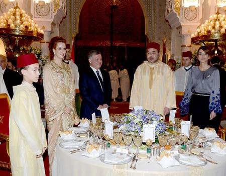 أقام جلالة الملك محمد السادس، مساء أمس الأربعاء في القصر الملكي في الدار البيضاء، مأدبة عشاء رسمية، تكريما لجلالة الملك عبدالله الثاني وجلالة الملكة رانيا العبدالله، والوفد المرافق.