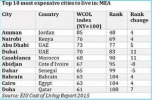 تصدرت عمان أغلى المدن بالتكلفة المعيشية في منطقة الشرق الأوسط وإفريقيا حسب التقريرالسنوي لوحدة الاستخبارات الاقتصادية (EIU) للعام 2015 والتابع لمجلة ايكونومست البريطانية حول تكاليف المعيشة في المدن.