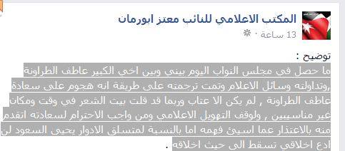 وحيث قام أبو رمان بنشر في صفحته على موقع التواصل الاجتماعي فيسبوك أن ما بدر منه تجاه المهندس عاطف الطراونة لم يكن هجوما بل هو عتاب للأخ الاكبير.