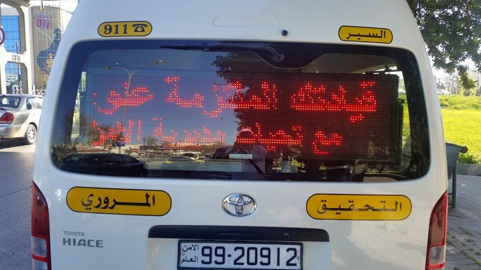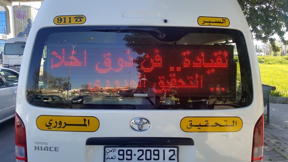 قامت إدارة السير المركزية التابعة لمديرية الامن العام بتشغيل لوحات الكترونية مثبة على المركبات التابعة لها ، تظهر فيها عبارات للتذكير بالقيادة الامنة والسير ضمن السرعة المحددة و الحفاظ على الهدوء اثناء القيادة .