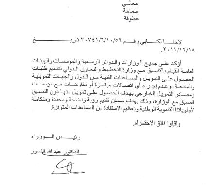 منع رئيس الوزراء الدكتور عبد الله النسور الوزارات والمؤسسات والهيئات الحكومية التواصل مع الدول والجهات التمويلية والمانحة إلا من خلال وزارة التخطيط.