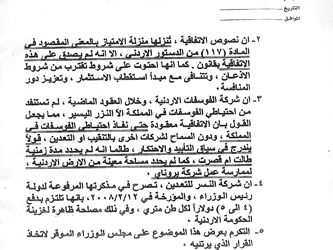 واكد العلاونه في رده القانوني' ان نصوص الاتفاقية تنزلها منزلة الامتياز بالمعنى المقصود في المادة 117 من الدستور الاردني الا انه لم يصدق على هذه الاتفاقية بقانون كما انها احتوت على شروط تقترب من شروط الاذعان وتتنافى مع مبدا استقطاب الاستثمار وتعزيز دور المنافسة'.