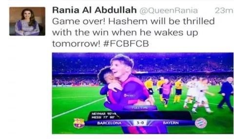 وقالت الملكة رانيا في التغريدة التي وضع عليها صورة اعلان فريق برشلونة بالفور على فريق بايرن ميونخ: 'انتهت المباراة.. سيكون هاشم سعيداً للغاية بهذا الفوز عندما يستيقظ'.