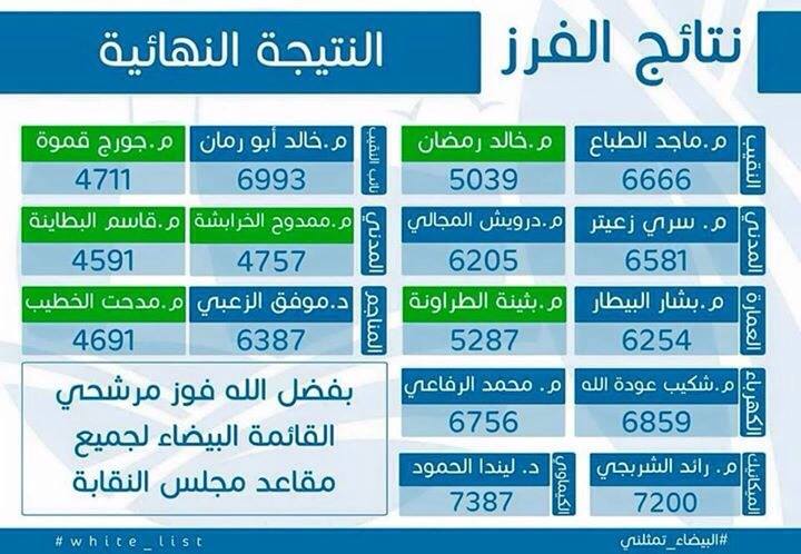 و بذلك حصلت القائمة البيضاء بكامل المقاعد في النتائج النهائية لانتخابات نقابة المهندسيين .