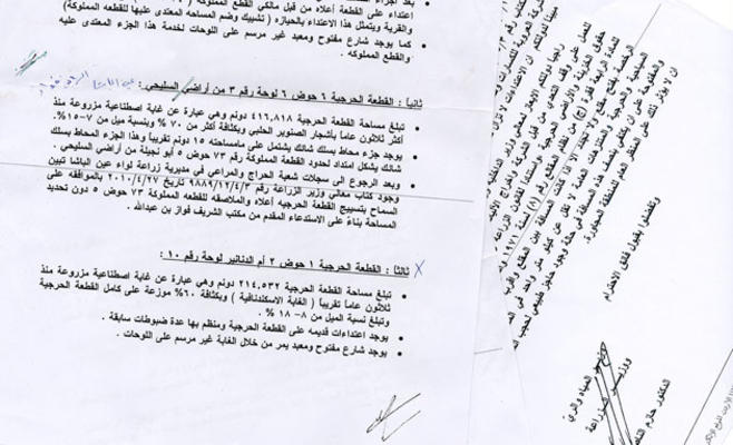 فيما أظهرت وثائق رسمية، موافقة مجلس الوزراء أو وزير الزراعة، أو كليهما، على بقاء حالات اعتداء ببعض المواقع والأراضي، رغم وجود قرارات قضائية أو رسمية، كانت صدرت بإزالة 'تعديات'، من قبل متنفذين، على أراضي حراج ودولة، تعود ملكيتها للخزينة العامة.