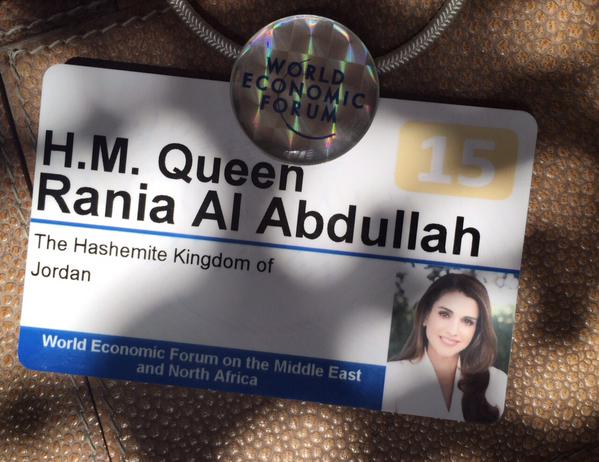 نشرت جلالة الملكة رانيا العبدالله عبر حسابها على تويتر صورة لبطاقتها الخاصة بالمؤتمر الاقتصادي العالمي ، الذي سيتم افتتاحه رسميا يوم غدا الجمعة برعاية ملكية سامية وكتب معلقتا على هذة الصورة لمتابعيها: