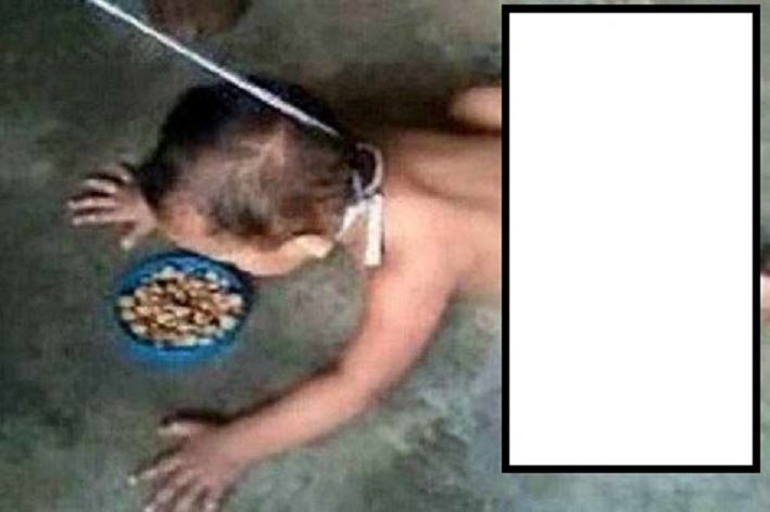 ويظهر في الصورة الطفل، البالغ من العمر عامًا واحدًا، وهو عارٍ تماماً و مربوط بمقود كلب، ويزحف على أرضية خرسانية، ويأكل من وعاء بلاستيك مثل الكلب.