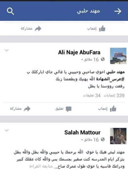 وقد سارع أصدقاء الشهيد ومحبيه منذ اللحظة الاولى لاعلان استشهاده للكتابة عبر صفحته الشخصية ونعي الشهيد.