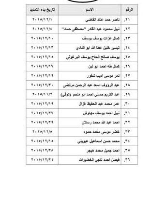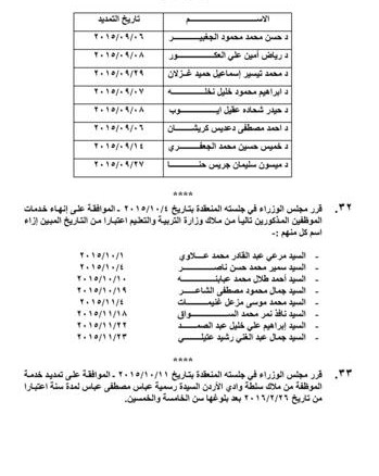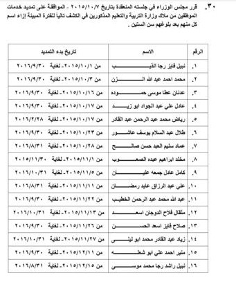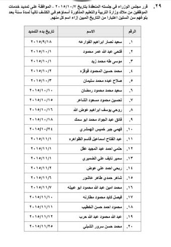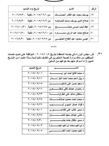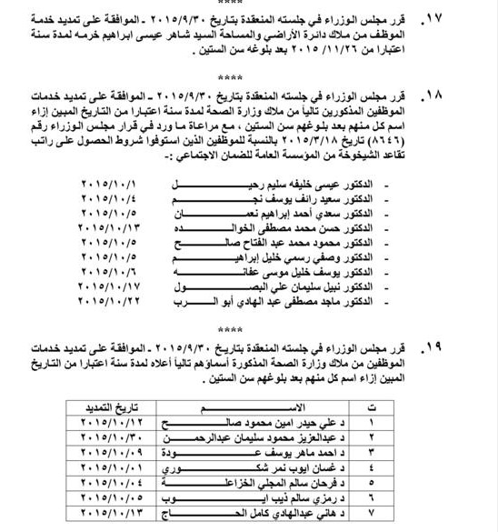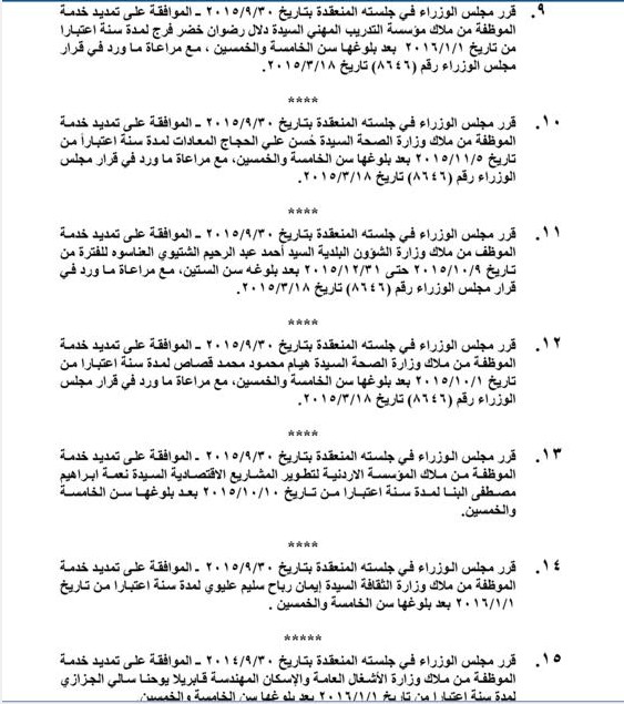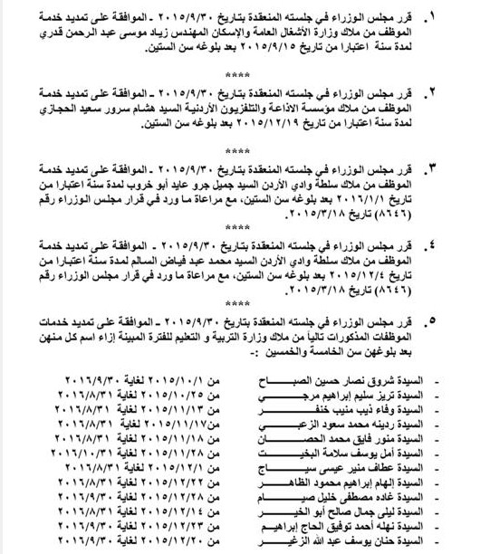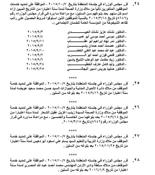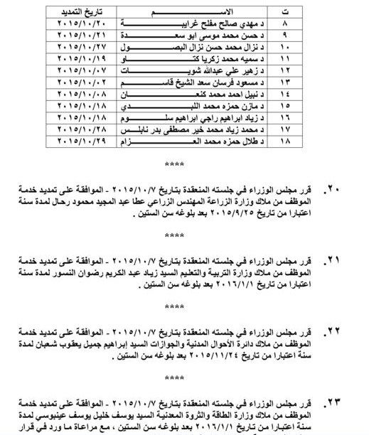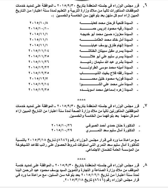 قررمجلس الوزراء في جلستة المنعقدة بتاريخ 30/9/2015 بتمديد خدمة 180موظف حكومي سنة كاملة بعد بلوغهم سن الستين.
