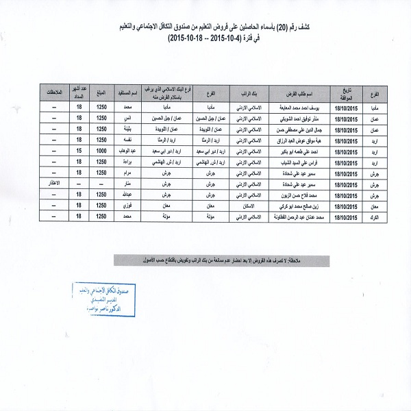 أعلن المدير التنفيذي لصندوق التكافل الاجتماعي والتعليم في نقابة المعلمين الأردنيين الدكتور ناصر نواصرة، عن أسماء المستفيدين من قروض التعليم ومنح وقروض الزواج وتعويضات الوفاة للفترة (4/10/2015 - 18/10/2015).