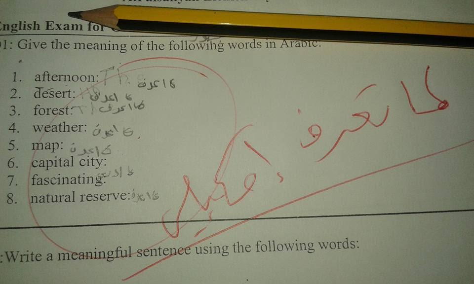 وقال معلم المادة : إن 'هذه الورقة تعود لأحد طلابي في امتحان مادة اللغة الإنجليزية للصف السادس'.