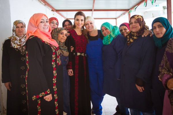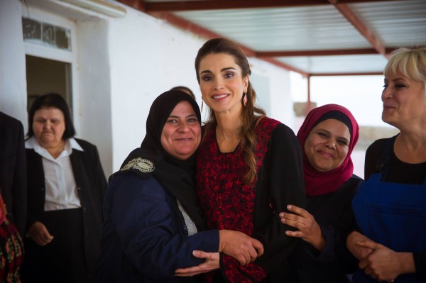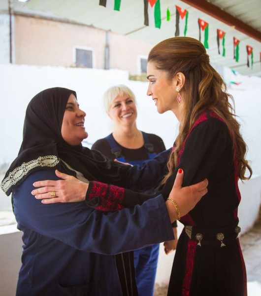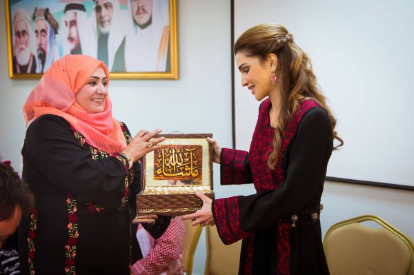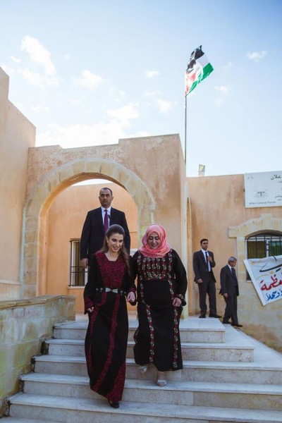 أما لزيارة جمعية "بصمة خير” في بلدة علان في محافظة البلقاء، فقد إختارت ملكة الأردن ثوباً تقليدياً أسود اللون مطرزاً بالخيوط الحمراء، مع حزام من الحبال المجدولة المزين بقطع فضية، وتزينت بأقراط يتدلى منها حجر أحمر على شكل معين، ورفعت نصف شعرها للخلف.