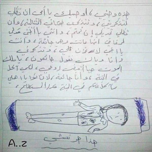 وكانت وصية الطفلة السورية، المكتوبة على ورقة، تصدرت مواقع مواقع التواصل الاجتماعي، وطلبت فيها من أمها، إن ماتت أن تتذكرها وتتذكر ضحكاتها المتتالية، كما أنها طلبت من أختها أن تخبر رفاقها بأنها ماتت وهي جائعة، وتمنت من أخيها أن لايحزن على موتها وأن يتذكر ما كانا يرددانه 'جائعون'، ومن ثم طلبت من ملاك الموت أن يعجل بقبض روحها كي تأكل في الجنة عنها وعن أهلها، وأنهت الوصية برسمة جسد فتاة في صندوق وكتبت تحته 'هذا نعشي'.