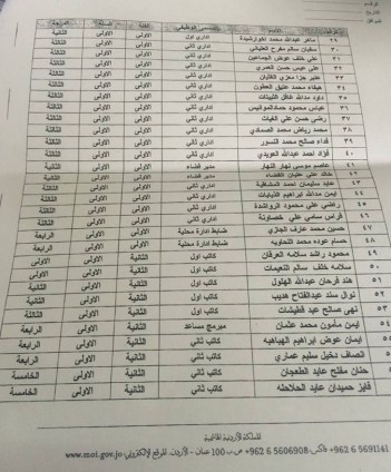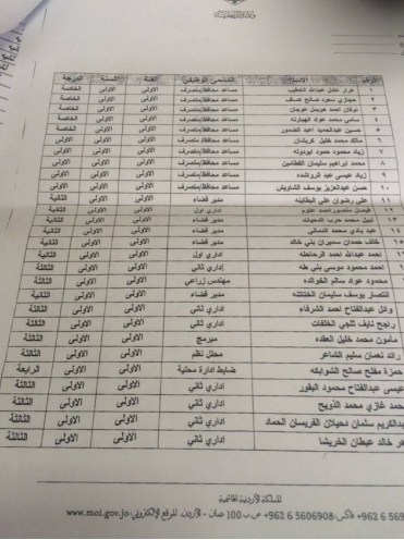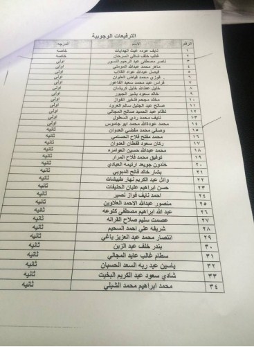 قرر وزير الداخلية سلامة حماد اجراء عدد من الترفيعات للموظفين التالية اسماؤهم اعتبارا من تاريخ 31-12-2015 وذلك لاحكام المادة 78،79،80 من نظام الخدمة المدنية رقم 82 لعام 2013 وتعديلاته .