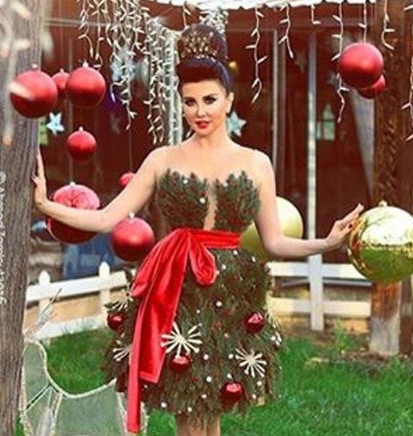 جيني تألقت في جلسة التصوير، بزي جعلها أشبه بشجرة الكريسماس المزينة بالهدايا والألعاب، من تصميم جورج جرادة، ورفعت شعرها لأعلى، بأنامل إبراهيم الحلبي.