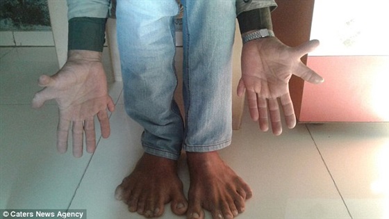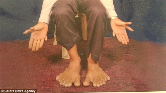 وفقا لما نشرته مصادر يعانى 'ديفيندرا سوزار' البالغ من العمر 43 عاما من 'غوجارات' بالهند، من حالة نادرة تسمى 'كثرة الأصابع' مما يجعله يمتلك 7 أصابع في كل كف من قدميه ويديه.