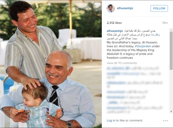 نشر سمو ولي العهد الأمير الحسين بن عبد الله الثاني الاحد ، صورة عبر حسابه على موقع انستغرام بدا فيها طفلا وتجمعه بوالده الملك عبد الله الثاني، وجده المغفور له بإذن الله الملك الحسين بن طلال.