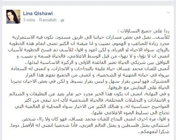 وناشدت مُطلقي الشائعات :' في النهاية، اتمنى ان يكون هذا الخبر مجرد خبر عابر بعيد عن التعليقات و الشتائم و الانتقادات و التحليلات المختلفة، فالحياة الشخصية لأي احد تبقى من اكثر المواضيح حساسية له. و هنالك الكثير من الاخبار سواء المحلية او العالمية التي تحتاج الى تسليط الضوء الاعلامي عليها'.