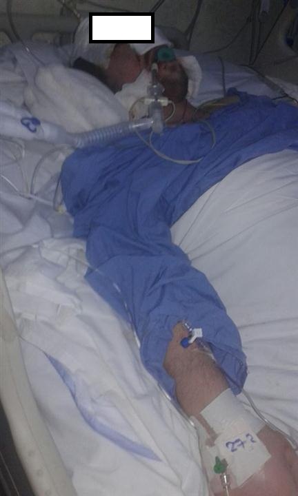 وقال ابن عم المصاب: إن ' ابن عمه يرقد الآن على سرير الشفاء بحالة موت سريري في مستشفى الجامعة بقسم العناية المركزة'.