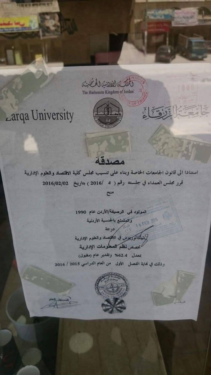 ربما لا يحتاج تجهيز 'فنجان قهوة' لزبون شهادة مزاولة وخبرة، الا أن الطالب الجامعي والعاطل عن العمل نورس الشيخ يلفت النظر من خلال 'بوفيه قهوة' صغير على طريق (عمان –الزرقاء) يعلّق فيه شهادته الجامعية بتخصص (MIS) وكأنها خبرة السنوات التي قضاها خلف أسوار الجامعة والدراسة ليتخرّج موظفا لتقديم القهوة.