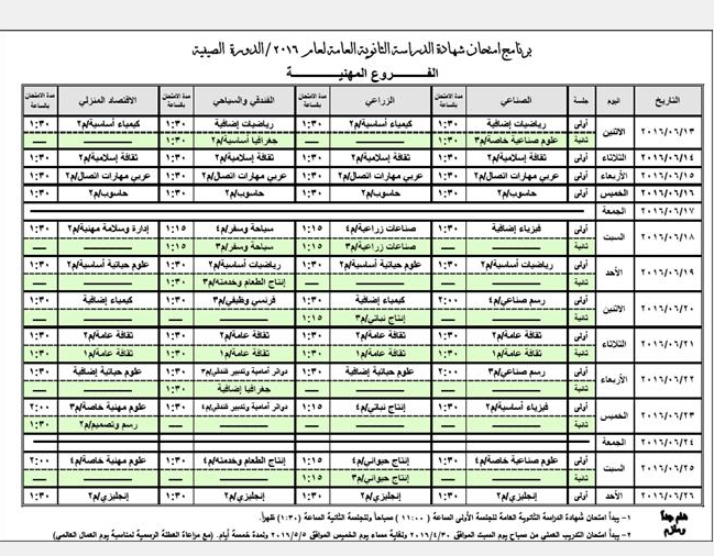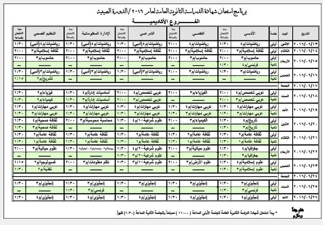 واضاف أنّ برنامج امتحان شهادة الدراسة الثانوية العامة، سيبدأ في الثالث عشر من 13/6/2016 وينتهي في 26/6/2016، مشيراَ إلى أن الجلسة الأولى من الامتحان ستبدأ الساعة الحادية عشرة صباحاً، والجلسة الثانية تبدأ في تمام الساعة الواحدة والنصف ظهراً.