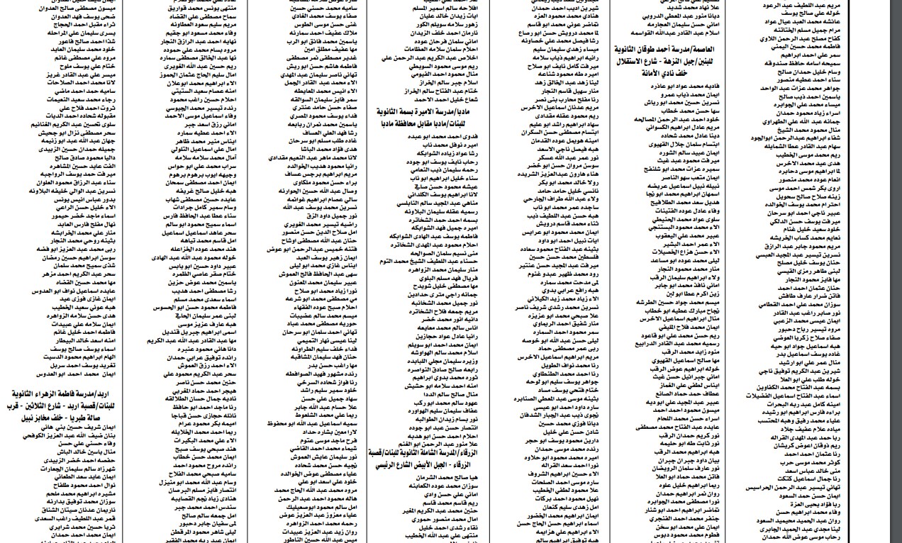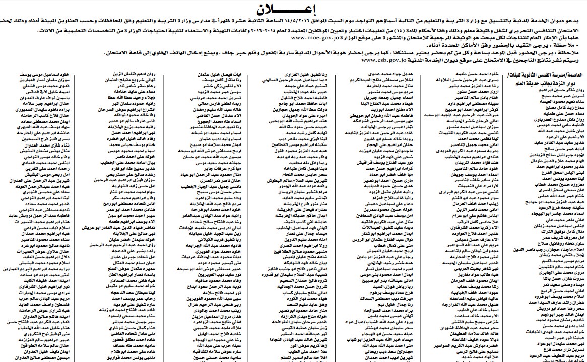 يدعو ديوان الخدمة المدنية بالتنسيق مع وزارة التربية والتعليم من التالية اسماؤهم التواجد يوم السبت الموافق 14/5/2016 الساعة الثانية عشرة ظهرا في مدارس وزارة التربية وفق المحافظات وحسب العناوين المبينة ادناه لحور الامتحان التحريري لشغل ظيفة معلم.