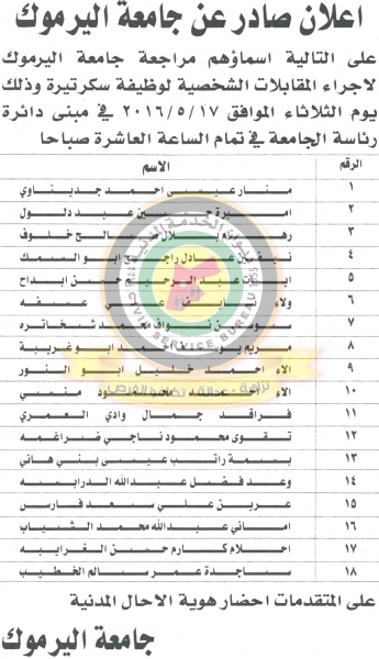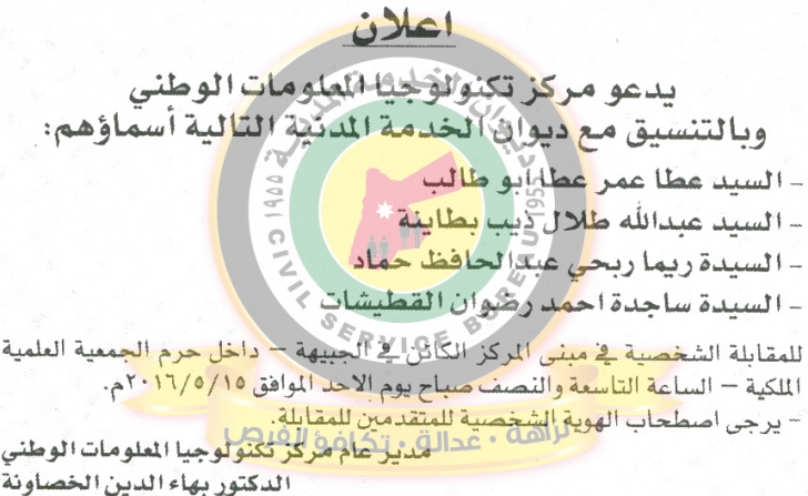 دعا ديوان الخدمة المدنية بالتعاون مع مختلف الوزارات والمؤسسات الحكومية، التالية اسماؤهم لاجراء المقابلات الشخصية وعقد الامتحان التنافسي لغايات التعيين.
