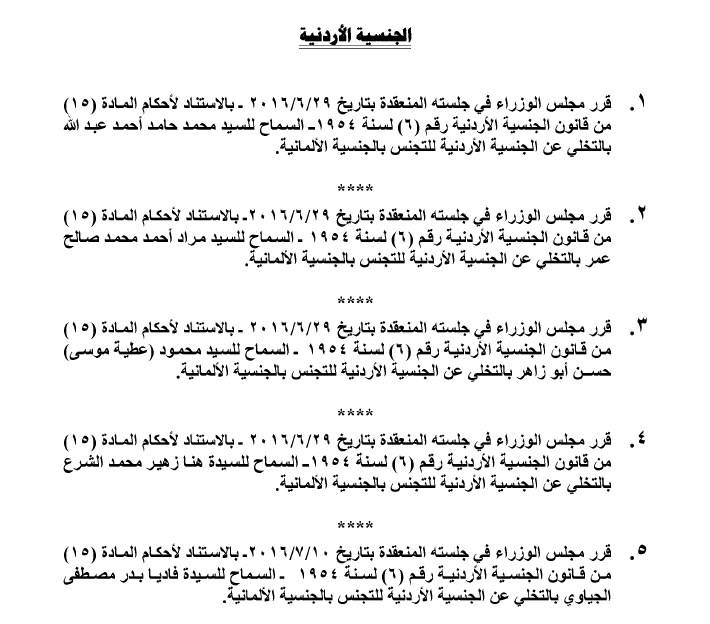 تخلى 5 أردنيين عن جنسيتهم الأردنية لصالح الجنسية الألمانية، وصدر قرار الموافقة على ذلك من مجلس الوزراء في جلسته التي عقدت في 29 من شهر حزيران الفائت.