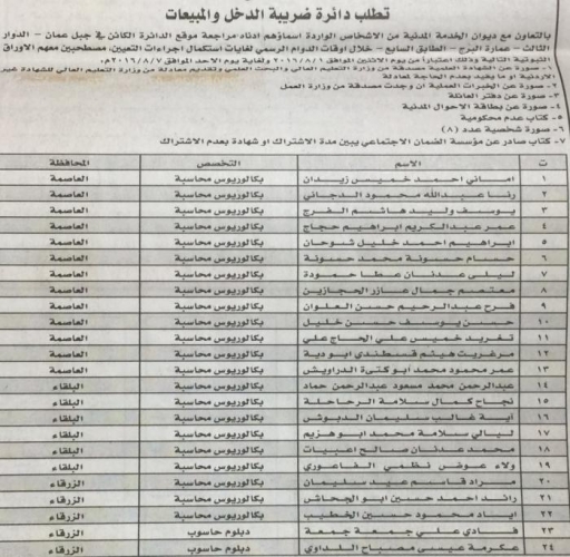 دعت دائرة ضريبة الدخل والمبيعات التالية اسماؤهم إلى مراجعة الدائرة اعتبارا من اليوم الاثنين لاستكمال اجراءات التعيين، وهم: