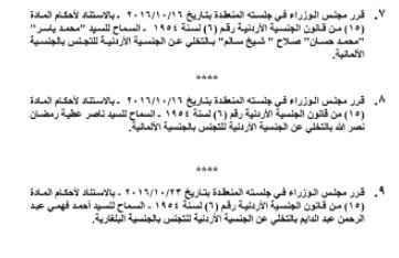 صدرت الإرادة الملكية، بالموافقة على قرار مجلس الوزراء، بالسماح لتسعة أشخاص، التخلي عن جنسيتهم الأردنية، للحصول على جنسيات أوروبية، حسب عدد الجريدة الرسمية الصادر الثلاثاء.