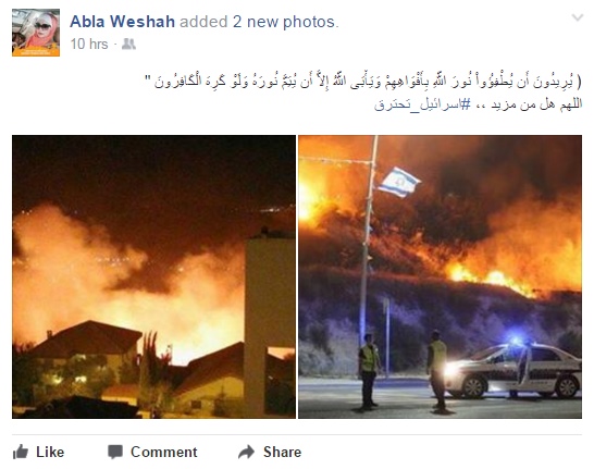 وعلق الناشطون على الحرائق بالدعوة الى الله ان تهلك تلك الحرائق الكيان لصهيوني وان تكون بداية لهلاكه ، كما حلل البعض ان تلك الحرائق هي عقاب من الله على قرار الكيان الصهيوني منع اقامة الاذان في الاراضي المقدسة والمسجد الاقصى و اراضي الـ48 ، وهو الامر الذي نفاه آخرون بالقول ان لاعلاقة بذلك وانها محض مصادفة.