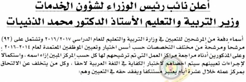 أعلن وزير التربية و التعليم الدكتور محمد الذنيبات عن أسماء دفعة من المرشحين للتعيين في وزارة التربية و التعليم 2016-2017 و تشمل على 92 اسماً مرشحاً تم اختيارهم حسب اسس تعيين الموظف المعتمدة و على المذكورة اسمائهم مراجعة مراكز العمل التي تم ترشيحهم لها.
