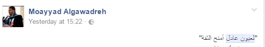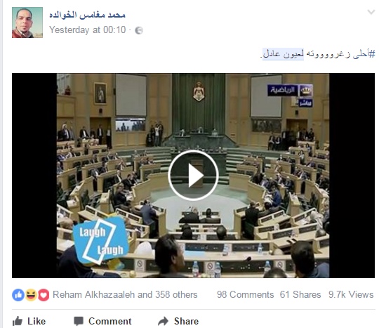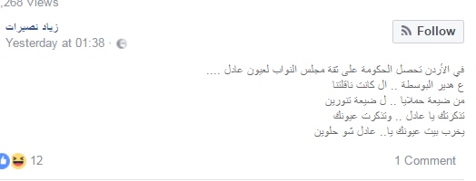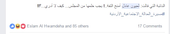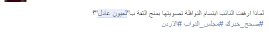 اجتاح هاشتاغ 'لعيون عادل' التغريدات والنصوص لدى رواد مواقع التواصل الاجتماعي ، وذلك تعليقاً على ماقالته النائب ابتسام النوافلة تحت قبة البرلمان عند منحها الثقة لحكومة الملقي حينما قالت ' لعيون الدكتور عادل ، امنح الثقة'.