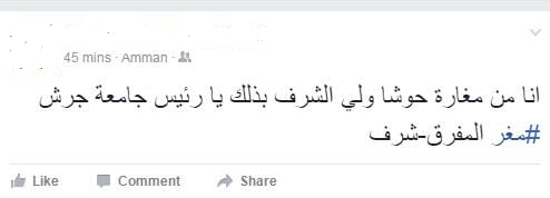 اعرب عدد من المواطنين على مواقع التواصل الاجتماعي عن غضبهم وستيائهم بكتابة عبارات على صفحاتهم الشخصية ، بعد التصريحات مثيرة للجدل من قبل رئيس جامعة جرش الدكتور عبد الرزاق بني هاني على احدى القنوات الفضائية .