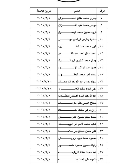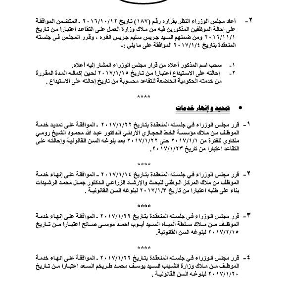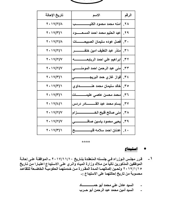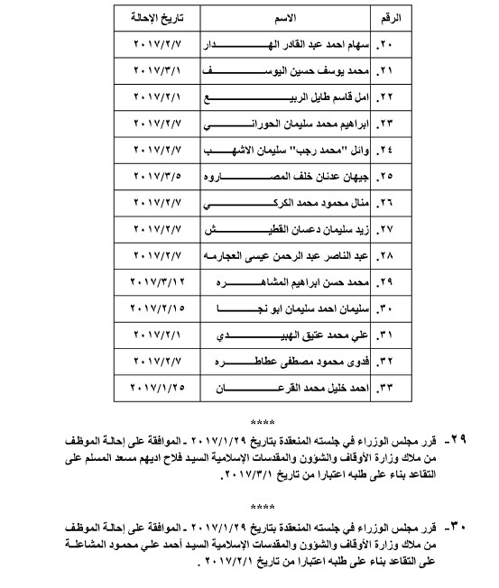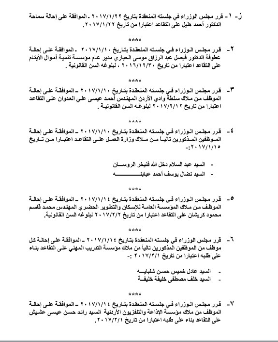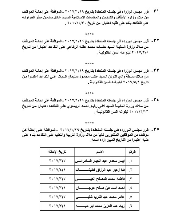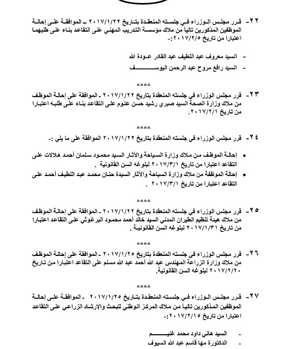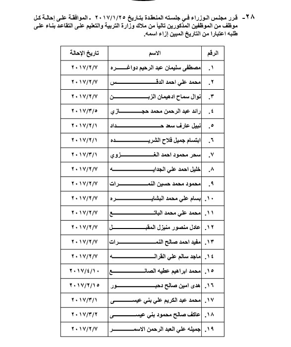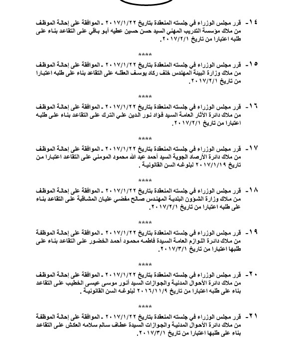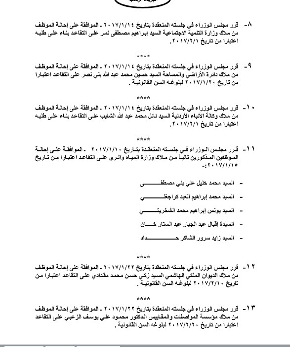 قرر مجلس الوزراء في جلساته المنعقدة في الشهر الماضي ،إحالة عدد من الموظفين في عدد من مختلف المؤسسات و الدوائر الحكومية الى التقاعد و هم التالي اسمائهم :
