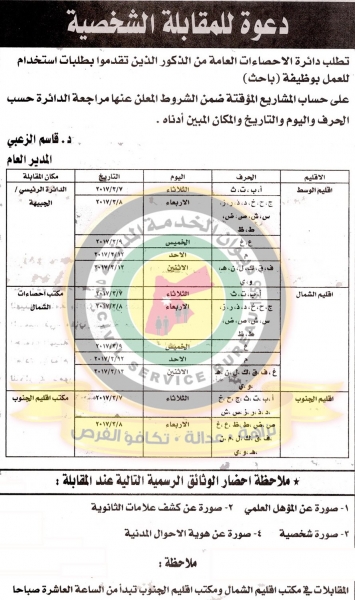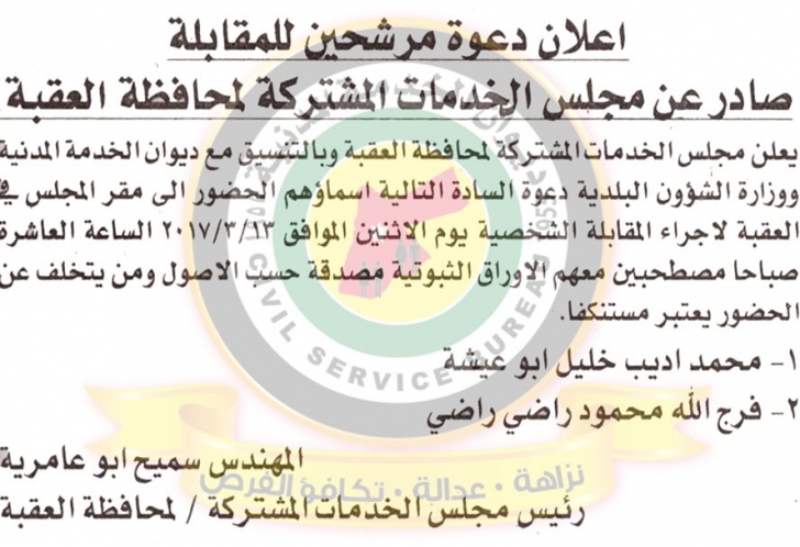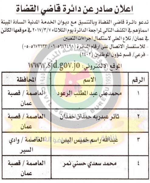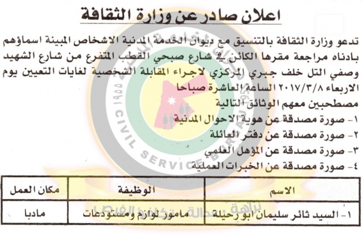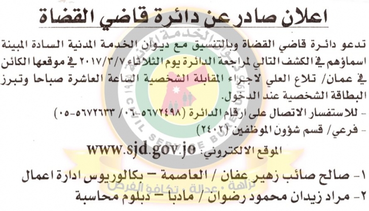 دعا ديوان الخدمة المدنية بالتعاون مع مختلف الوزارات والمؤسسات الحكومية، التالية اسماؤهم لاجراء المقابلات الشخصية وعقد الامتحان التنافسي لغايات التعيين.
