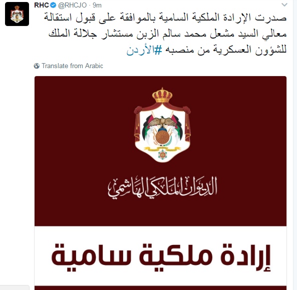 وكانت صفحة الديوان الملكي الهاشمي الرسمية على موقع تويتر نشرت تغريدة تؤكد فيها استقالة الزبن من منصبه كمستشاراً للملك للشؤون العسكرية.