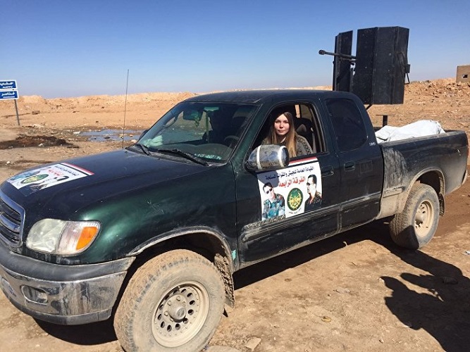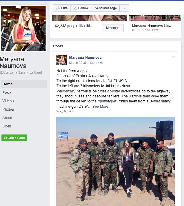 ونشرت بطلة الأثقال الروسية، على صفحتها الفيسبوكية، بتاريخ 26 من الجاري، صورة لها مع بعض جنود #الأسد في حلب، ويظهر في خلفية الصورة يافطة تشير إلى طريق حلب – خناصر.