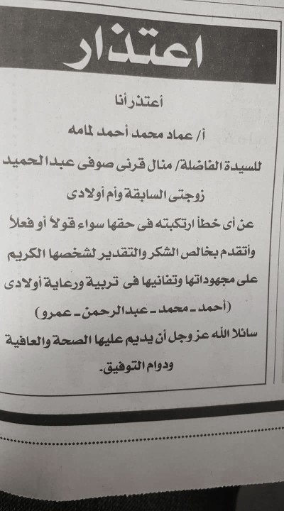 ونص الإعلان يقول: اعتذار.. 'أعتذر أنا عماد محمد أحمد لمامة ، للسيدة منال قرني صوفي عبدالحميد ، زوجتي السابقة وأم أولادي، عن أي خطأ ارتكبته في حقها سواء قولاً أو فعلاً، وأتقدم بخالص الشكر والتقدير على تفانيها في رعاية أولادي أحمد ومحمد وعبد الرحمن وعمرو.. سائلاً الله أن يديم عليها الصحة والعافية'.
