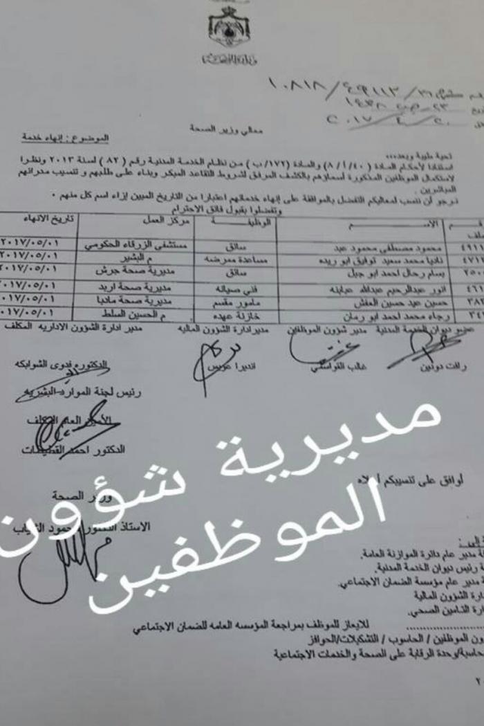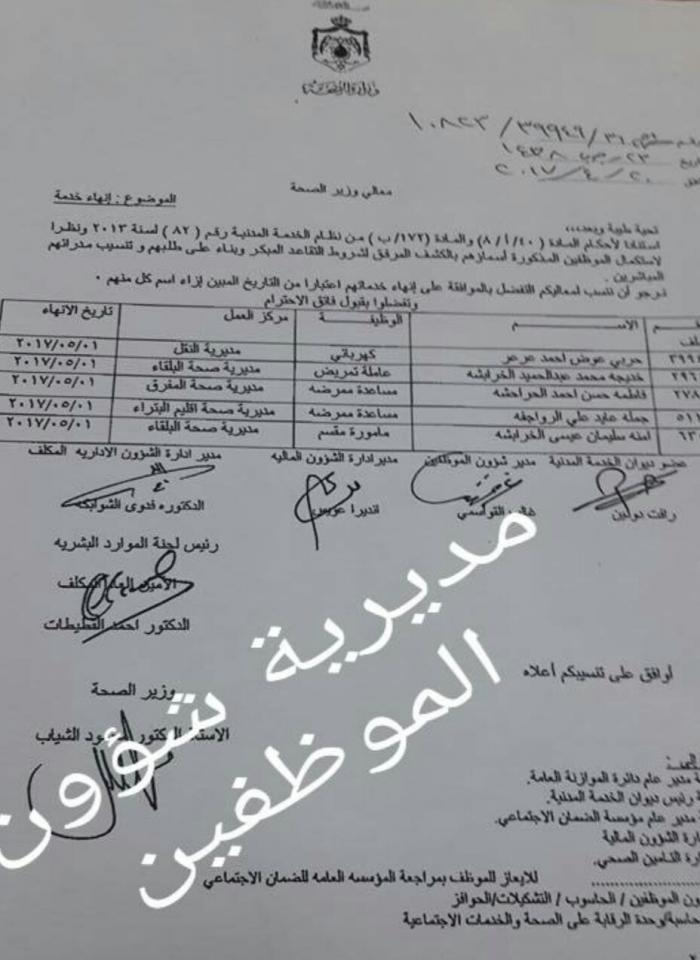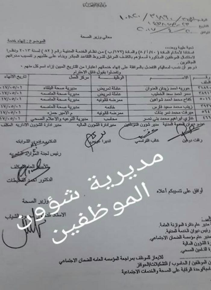 و تك انهاء خدمات 17 موظفاً في الوزارة اعتباراً من تاريخ 1/5/2017، وتالياً الاسماء: