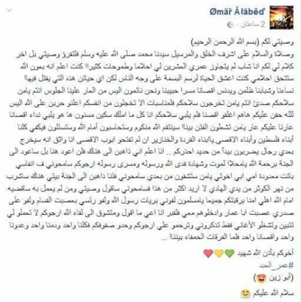 وهذا نص وصية عمر عبد الجليل منفذ عملية رام الله