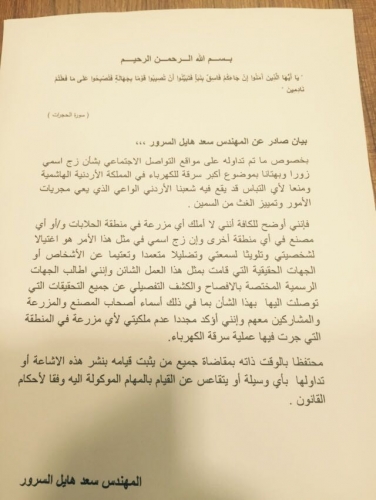 أصدر وزير الداخلية الاسبق سعد هايل السرور بيانا استنكر من خلاله زج اسمه في حادثة أكبر سرقة كهرباء في الاردن.